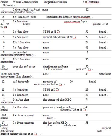 The number of HB02 treatments varied from 1 to 95. For those who healed, the number of treatments varied from 24 to 95 with a median number of 47. For those who failed to heal, the number of treatments varied from 1 to 74 with a median number of 24. Patients' treatments were continued until clinical judgment determined that maximum benefit had been obtained or until biopsy of the lesion demonstrated tumor presence in the wound or, in one case, lung metastases was detected.