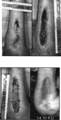 The results of treatment are exemplified by patient number 10 whose serial wound photographs are depicted in Fig. 1. This case was selected for several reasons: her injury involved damage to both soft tissue and bone, and therefore successful intervention was a more significant accomplishment than closure of a soft-tissue only wound. Furthermore a long-term follow-up photograph taken 14 yr after successful intervention was available and confirmed that the effects of HB02 in the treatment of radiation damage of the extremities provides a durable repair of the injury.