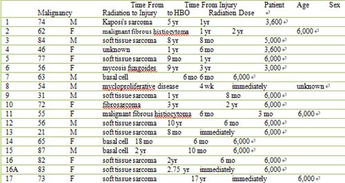 Since 1979, we have treated nine women and eight men with HB02 for radiation necrosis of the extremities. Sixteen of these 17 patients are available for follow-up. Malignancies irradiated included several different types and are listed in Table 1. The patient's ages ranged from 21 to 87 with a median age of 64. The interval from radiation therapy to injury varied from 4 wk to 17 yr, with a median time of 21 mo. The time from the manifestation of the injury to the referral for HB02 varied from immediately to 3 yr, with a median time of 6 mo. None of the patients had had any progression to healing in that time interval using a variety of conservative therapies including wound care and antibiotics. Two of 17 patients were referred less than 2 yr after their irradiation. Radiation doses varied from 3,600 to 6,000 cGy with a median dose of 6,000 cGy. Five of 17 patients had doses less than 6,000 cGy. The vast majority of injuries (17 of 18) involved the lower extremity. One patient had radiation necrosis of the upper extremity. Seventeen of the 18 wounds demonstrated only soft tissue involvement while the one patient with upper extremity involvement had bony as well as soft tissue involvement. Patient number 16 was treated for an original ulcer over the anterior tibia, with resolution after 43 treatments. About 9 mo. after this first course of therapy, the patient had a recurrence of the wound, although smaller. This recurrent wound was treated with a second course of HB02. Table 2 gives a complete description of pretreatment characteristics.